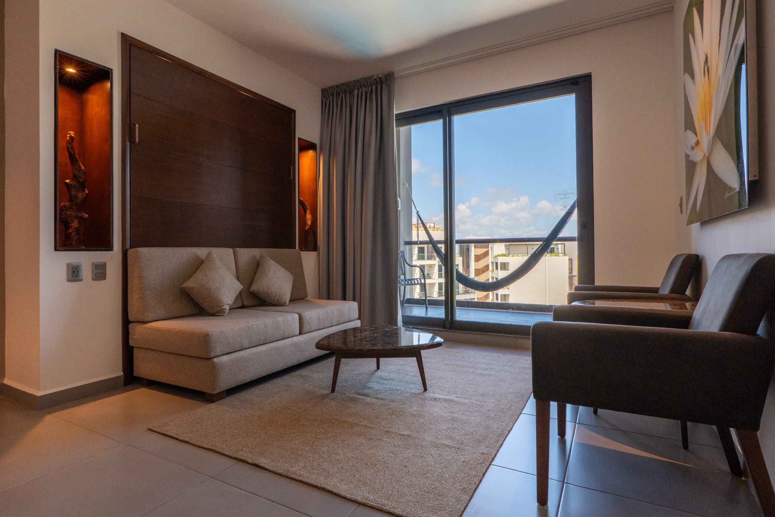 All of our suites offer beds with ultra-comfort mattresses, murphy beds and relaxing hammocks in private balconies. Exclusive line of organic amenities and spacious stone walk-in shower in all our accommodations.
